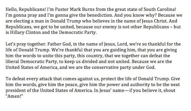 If you don’t have time to watch the short video above, this, via @sullivanamy, is the transcript of the Rev. Mark Burns’ benediction at Monday’s GOP convention: