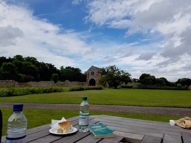 We are in Dunster, a medieval village in Somerset, England. Today, we visited Cleeve Abbey, a ruined Cistercian abbey that is close to Dunster: http://www.english-heritage.org.uk/vi.... The Abbey church was destroyed completely at the time of the Dissolution, but the sacristy, the monks’ dormitory, and the refectory survived in amazingly good condition, as did (to some extent) the cloister, so it is well worth visiting. They have the Rule of St. Benedict for sale in the gift shop. I attach views of the Abbey gatehouse from our picnic table for your consideration. We bought our picnic food at the Dunster Village Shop and Deli, including their “cheese of the week,” Pendragon Buffalo Cheese from the Somerset Cheese Company: