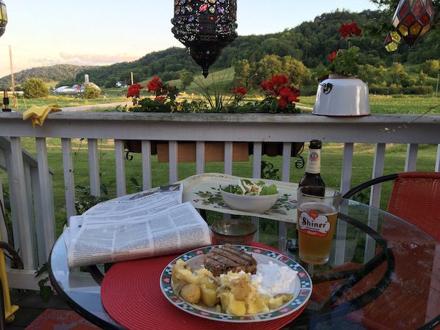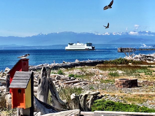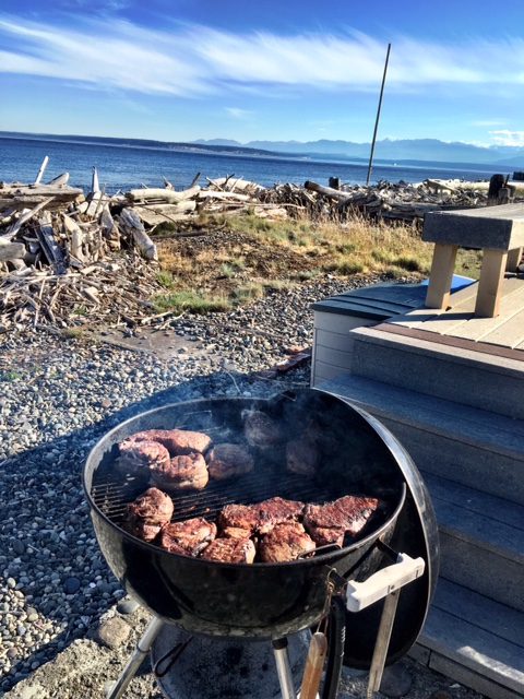 11 years we’ve been returning to this spot. Although salmon, mussels — nearby Penn Cove is the oldest mussel farm in the country — is the norm, I’m grilling steaks on Puget Sound tonight, watching the ferry cross to Port Townsend and back.