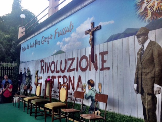 While we Americans have been celebrating our Independence Day, our friends the Tipi Loschi, in San Benedetto del Tronto, have been observing the anniversary of the passing of the Blessed Pier Giorgio Frassati, who died on this date in 1925. It’s also an occasion for them to celebrate G.K. Chesterton, their other unofficial patron saint. I asked Marco Sermarini to explain the concept of “Eternal Revolution” that they mark above. He responded:
