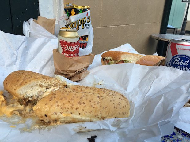 Shrimp philly, roast beef poboy, Miller High Life, PBR, and Zapp’s chips.