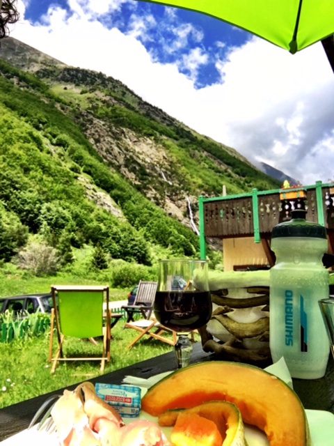 Melon and jambon cru, followed by pork with mustard cream sauce, a quick break from Alp-biking.