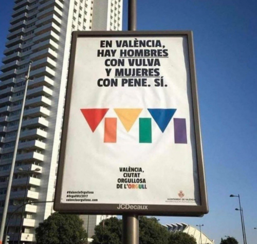 It reads: “In Valencia, there are men with a vulva and women with a penis. Yes.”