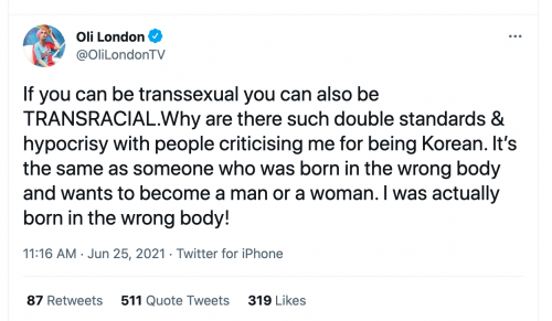 Check out this insanity. Oli London, a mentally disturbed young Englishman who has a bizarre obsession with the K-pop star Park Jimin, has had many plastic surgeries in an attempt to look like his idol. Now he has finished his surgeries (he says), and believes he looks Korean. Thus, he has announced that he is “transracial” — he is no longer an Englishman, but a Korean. A non-binary Korean. Look: