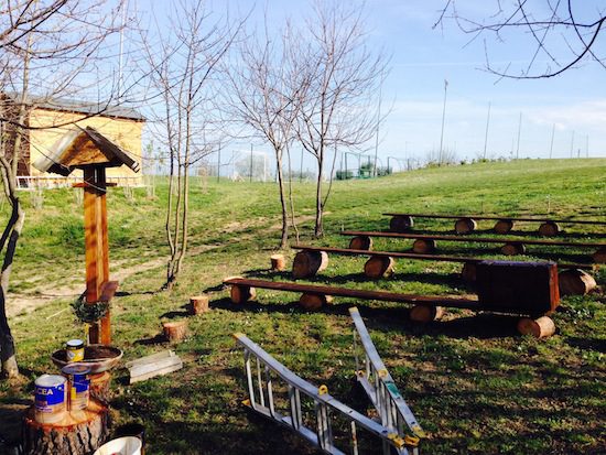 Speaking of cultivation, when I got home from church today, I found in my email some photos sent by Marco Sermarini, my friend and a leader of the Tipiloschi, the lay Catholic community in San Benedetto del Tronto. When I was there last month (see here for those details), Marco took me to the top of a hill outside the city, overlooking the Adriatic. The community acquired the land and renovated a small house on it. They began to clear and to restore the land to make it into a retreat for the community, and for anyone else who wants to come be with them. Marco took me walking down what is going to be a promenade down an orchard. The Tipiloschi will be cultivating the land to bring forth fruit and vegetables, and in so doing will teach themselves and their children how to garden. The plan is to open the garden and orchard to schoolchildren, so they can learn about nature. In the photo above are some of the men of the community, working on the orchard walk. Below, a photo of some of the kids on the land, and a photo of a place for prayer and assembly they are building in the garden.