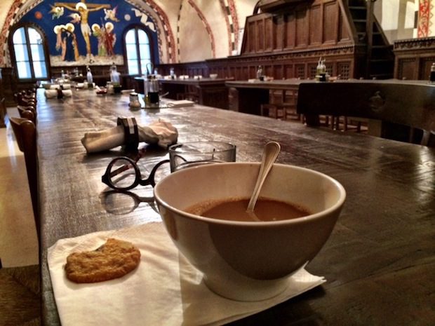 This is my breakfast on Sunday morning in the refectory of the Monastery of St. Benedict, in Norcia. A bowl of milky coffee and a cookie (there was more available, but I was really sick with a sinus infection, and had no appetite). It makes me so happy to see this place again in this image.
