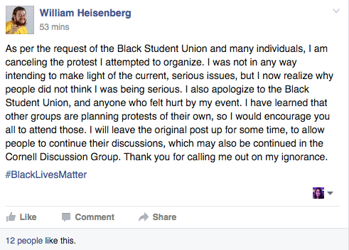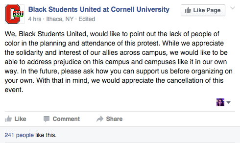 This one is my favorite so far: black Cornell students compel white SJW to cancel planned march in solidarity with the black cause, because he’s white. Look: