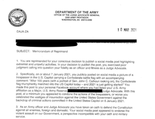 However, the post was just a convenient excuse to help the DoD Kommissars accommodate their political masters’ mandate to remove Conservatives from the ranks. That has always been the experience of those living under both soft and hard totalitarianism — the oppressors can always find a justification. In order to accomplish their aims they have to have an enemy — and the enemy of these times is, of course, white supremacists. Once they’re able to portray you as the enemy, then the next leap (towards elimination) is a much easier one to make (just ask Bonhoeffer and the Jews).I wish I had not deleted the post now, although I did after only a few days. The tenor of the comments was in much the same vein as the author’s intended meaning — “What Robert E. Lee and the Army of Northern Virginia couldn’t accomplish in four years, this clown just did in 4 minutes… lol.” And, keep in mind, my post was made contemporaneously with the events as they were happening — I actually lifted the photo from NBC News. In legal terms, the post was equivalent to an “excited utterance” — I was struck by the sheer historical immensity of the occasion; at that point in the day, no one had died, etc. and I didn’t know the depths to which the Alinskyites would exploit the situation (“never let a crisis go to waste”).If I had received a counseling statement (a military slap on the wrist) I would’ve admitted with chagrin a lapse in judgment and apologized for my jest made in poor taste. But this is so over the top, it requires an equal and opposite reaction. Regardless, at the end of the day, free speech is free speech — or at least it used to be. Take a look at the attachments and then let me know what you (really) think!