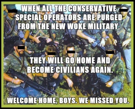 What I really think is that this military judge advocate exercised poor judgment by joking in poor taste. But it was clearly a joke — it had a smiley-face emoji — and not an endorsement of sedition. He deserved at most a slap on the wrist. Maybe the Army knows something more about this man and his views than is evident here, and that information justifies its harshness — that is, maybe the Army was listening in on his phone (in which case, did it have a warrant)? But based on what we see here — and acknowledging that we only have this man’s side of the story — this really does seem like an extraordinarily rash punitive action. They have basically ended this man’s military career, it sounds like. This, over a single jokey comment. Is this really what the military means by attacking extremism in the ranks? Absolutely, go after closet neo-Nazis and Ku Kluckers. Get them out of the military at once. But to destroy the career of an Army lawyer because of that? Because of a joke?I would love to know what other soldiers reading this case think of it. And I would like to know what other military personnel are facing on this front.Again, it seems to me that nobody can object to actual neo-Nazis and similar extremists being unmasked and forced out of the military. But if soldiers, sailors, and airmen are facing the end of their careers for piddly social media postings like what got my reader into trouble — if that’s what it means to be an “extremist” in the new woke military — then that feels like a political purge. I received an e-mail today from another reader in the military who said that the wokeness is coming so strong that they are now expected to accept that it is just to keep white males from promotion simply because they are white males at a time when the senior leadership wants to see women and people of color moved up. My correspondent said that the woke consciousness is “poison” for the armed services, and that this is not what he signed up for.If we really are at the outset of a political purge in the armed services, what does the Biden administration think they are creating in this country? A different reader sent me this meme today:Obviously, I didn’t mean to paint a target on my back but, admittedly, made it easy for them (yet who knew at the time that the ensuing witch-hunt was coming?). In this day and age where anti-racism is the ascendant tenant of the state religion, anything with a Confederate flag is immediately suspect. Never mind that I am a bonafide Military History Nerd and Civil War Reenactor who wears blue as much as gray; the irony of Calhoun, et al was lost on my unintended audience (although my actual “friends” understood perfectly well). But the way my words were lifted out of context and their meaning twisted is what is so especially galling (see the emoji, General? This is what is called “satire.”).