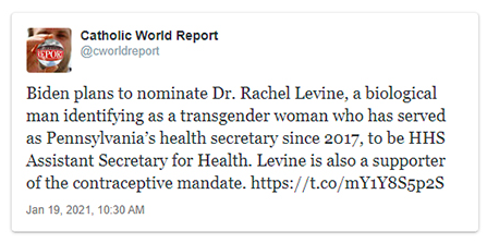 Here’s a pertinent example. Catholic World Report, which published the Müller interview, has been suspended from Twitter since January 23, for posting a link to a news brief on Rachel Levine, the transgender Biden nominee to a position in the federal health department. From a story CWR just posted on the situation, the tweet that got CWR in trouble: