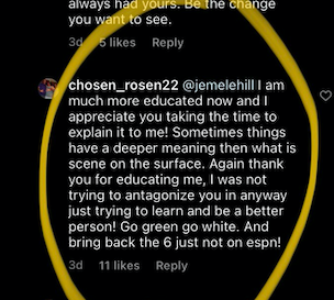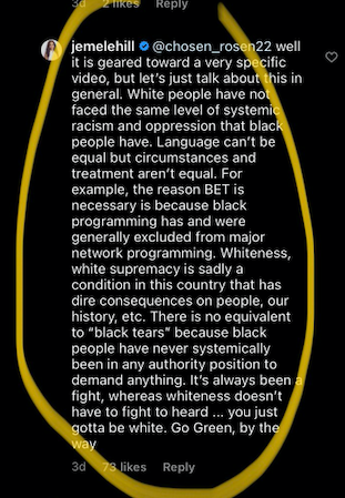 From my point of view, Chosen_Rosen22 ought to be ashamed of himself. He has allowed someone to demean him on racial grounds, and accepted that he deserves to be. More broadly, Jemele Hill and Chosen_Rosen22, as well as the business executives who make Hill’s career possible, are building a culture in which antiwhite racism is not only tolerated, but celebrated. A culture in which people are taught to take pleasure in the racial humiliation of others.