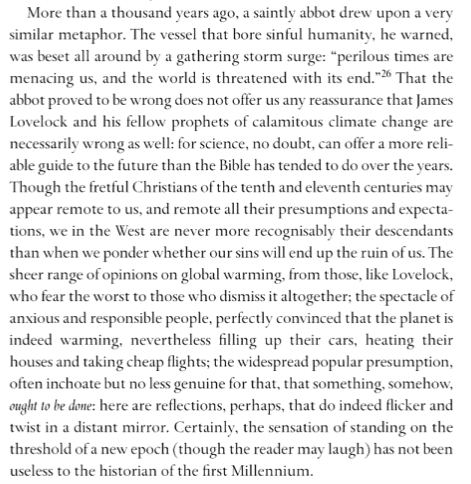 Seriously, though, it’s fascinating to think that Alabama is a thousand years and an ocean away from Europe at the first millennium, but people there — and in many parts of America — are still very much thinking and talking about the Second Coming of Christ. Here’s a passage from the book’s introduction in which Holland reflects on how people around the dawn of the third millennium are also worrying about the end of the world, e.g., scientists and climate catastrophe:
