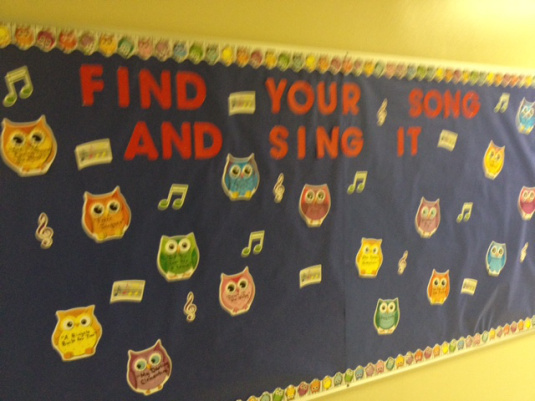 This is my bulletin board in the hall. It has owls with the names of the songs I taught the kids last year.