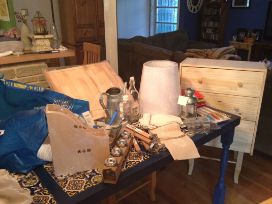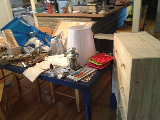 Okay, here’s the rules: I am posting a picture with 2 angles of the haul I brought back from IKEA. I’ll also list everything. Leave a guess in the comments here or on Facebook, and the person who comes the closest by breakfast Sunday morning will win a $10 gift card to Amazon or BN. Fun, right?