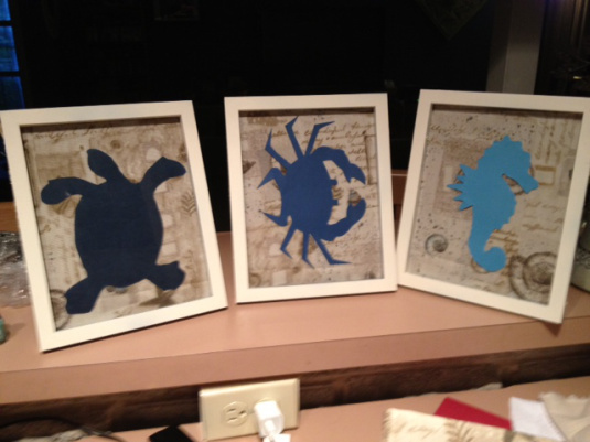 I came home and traced a crab, sea turtle and sea horse on three different shades of blue scrapbook paper, then cut them out with the tiny scissors. I cut out rectangles of the ocean print and centered the silhouettes, and was just about the open the $10 frames when I remembered I had some black frames and white spray paint. What would the Junk Gypsies do? They would try it. If it didn’t work, I still had the $10 frames.