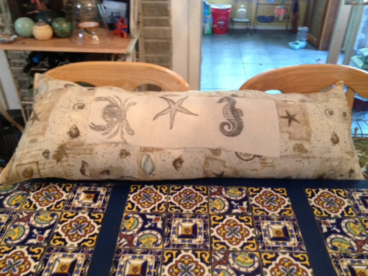 Then I cut out rectangles of muslin, ironed it onto freezer paper and ran it through the laser printer. If I’d been thinking, I would have downloaded the images, placed them in a document and would have been able to center the images. As it was, I had to play jigsaw puzzle to put them together. Then I added the seaside fabric to each end to make it a long pillow. I took the remaining fabric and wrapped it around so the muslin images were “framed” in the seaside fabric.