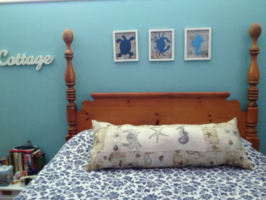 So after I bought my little bedside table the other day, my room has a very beach cottage-y feel to it. I decided I wanted to go whole-hog with that idea, and Saturday night after dinner, I had Fred take me to JoAnn’s because I had some ideas (Pinterest, of course.)