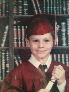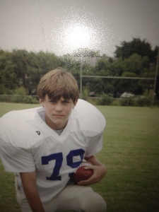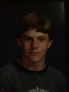 Freshman year. Pretty sure his shirt says, “Needs More Cowbell.” He wore music-relatedt-shirts for 3 years straight after having to wear a uniform in middle school.