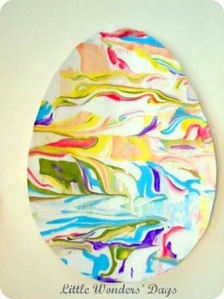 The kids and I are both fascinated by the marbling of the paint. It's messy as hell, though. You fill a pan about an inch thick with foam shaving cream, then dribble paint over the top in a random design. Then press a piece of paper (I'm using manilla paper cut in an egg shape) into the shaving foam, peel out of the pan, squeegee the foam and paint off and it leaves a cool design.