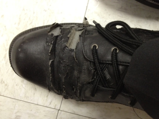 I'm walking around monitoring the test and I look down at my boots. I've had them awhile, haven't worn them in awhile, but I didn't want to wear tennis shoes with dress pants. The boots were disintegrating!!! It was the weirdest thing. This is how they looked by lunch. They'd been danged near perfect (a little dusty) when I put them on, and I was feeling guilty about never wearing them.