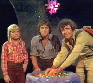 Linda Laurie's series theme music has become part and parcel of the American pop culture landscape, and it acquaints viewers with the story of Land of the Lost better than any synopsis. To paraphrase, Rick Marshall (Spencer Milligan), Will (Wesley Eure) and Holly (Kathy Coleman), -- on a routine expedition -- experience the "greatest earthquake ever known." They plunge down a waterfall in the Grand Canyon and find themselves lost in a closed, prehistoric, pocket universe known to its bizarre denizens asThe Land of the Lost.