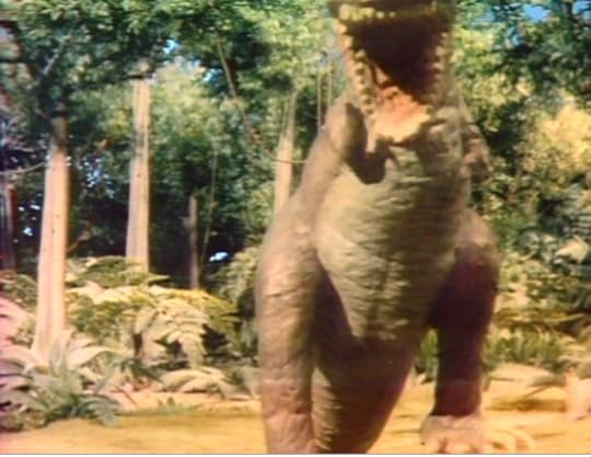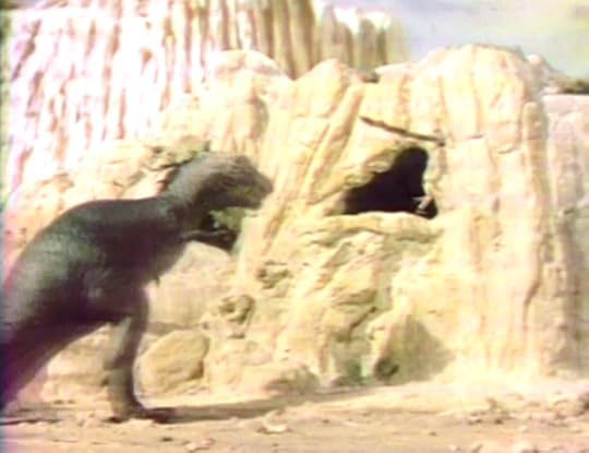 As the following images reveal, the humans are safe inside the cave, even from rampaging, hungry dinosaurs. None too pleased about this fact, Grumpy turns away from the cave -- and toward us -- and lets out an earth shattering roar.