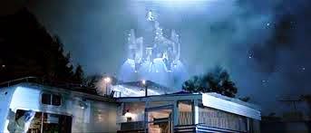 But below the GunStar -- closer to us in the shot, at the lower left-hand corner of the frame -- stands the neon, flickering star icon/sign of the Starlite/Starbrite Trailer Park.