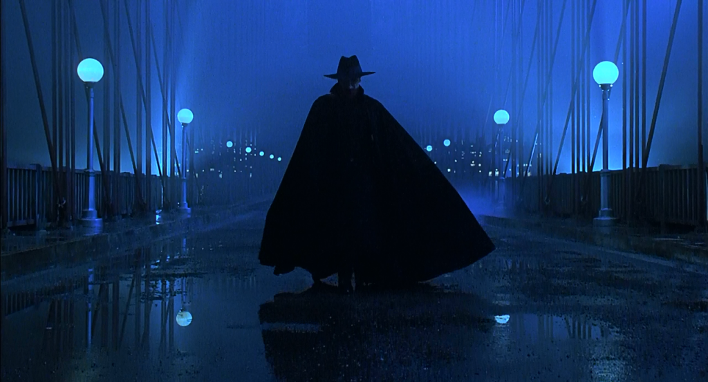 The Shadow also feels very much like a child of Tim Burton’s Batman. The first scene after the Tibetan prologue in The Shadow , for example, imitates the opening scene of Batman to an uncomfortable degree. Just as the mysterious Batman terrorized street level criminals in Gotham City in that film, The Shadow here confronts a number of thugs on the Brooklyn Bridge.