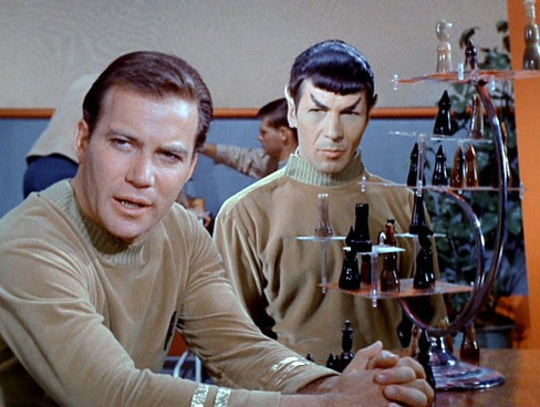 (Leonard Nimoy) locked in a chess game, with Spock showing “irritation” at Kirk’s