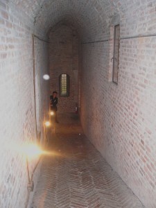 Accompanied by my sister, I flew to Ferrara, arriving in the city after dark. We located our hotel, dumped our bags and went in search of the Castello straight away – I couldn’t wait! Rounding a corner, a few minutes from the hotel, we walked straight into it. Looming up out of the darkness, it was floodlit an eerie pale orange; I was gobsmacked. My sister laughed at me, as I walked slowly around the edge of the moat, mouth open, staring up at the place I had been ‘living’ in for months. It was perfect: huge and dark and, in the event, far more impressive even than I had imagined. I had seen photographs, of course, and studied floor plans, and I’d even watched the permanent webcam they have running there, but nothing had prepared me for the sheer bulk and impact of the place. It sits in its place in the city-centre like the Godfather at the head of the table, glaring around, silently daring anyone to defy him, and it’s quite clear the place hasn’t changed a scrap in five hundred years.