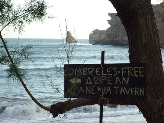 This is Akoumia beach, to the east of the Triopetra rocks which provide a striking landmark on this stretch of coast. That first day, we were the only people on this beach; the only people at Apanemia taverna for lunch. The taverna had recently opened, a new venture for the Koumandakis family. Stelios and his mother fed us with delicious octopus in red wine sauce and rabbit stifado, brought us chocolate biscuit cake to taste, and gave us raki made from their own grapes. They welcomed us as if we were friends, and we were charmed.