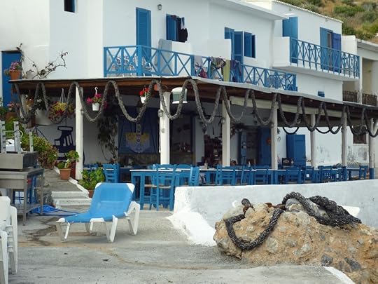 Agia Fotini taverna with its turqouise shutters and tablesis so close to the sea that, on a windy day, your food is seasoned with salt spray. You can read a Guardian article with more details here