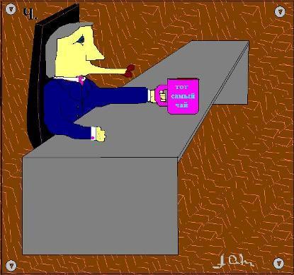 Он работал все активнее и активнее, он стал правой рукой начальника, вел с ним доверительные беседы, и тот все чаще говорит в селектор: «Любочка, две чашечки чая, пожалуйста. С лимончиком, как всегда!» Чиновник блаженствовал, но это было полублаженство. Настал день, когда он попал-таки в кабинет начальника, а того двинули выше (или ниже, что тоже бывало, но редко). В любом случае Чайный Чиновник зазывал бывшего благодетеля и, изнывая от восторга, говорил небрежно: «Любочка, две чашечки, как всегда!»