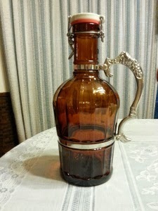 Well, $40 later, we were the proud owners of a "beer growler," and we got it for $4.99 less than the sticker price at Texas Slav & German Warehouse in Bremond (they donated it to the auction). Aside from the heavy brown glass, it has a ceramic top and an ornate silver handle.