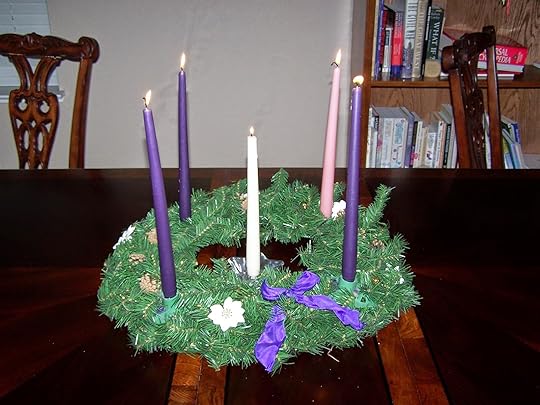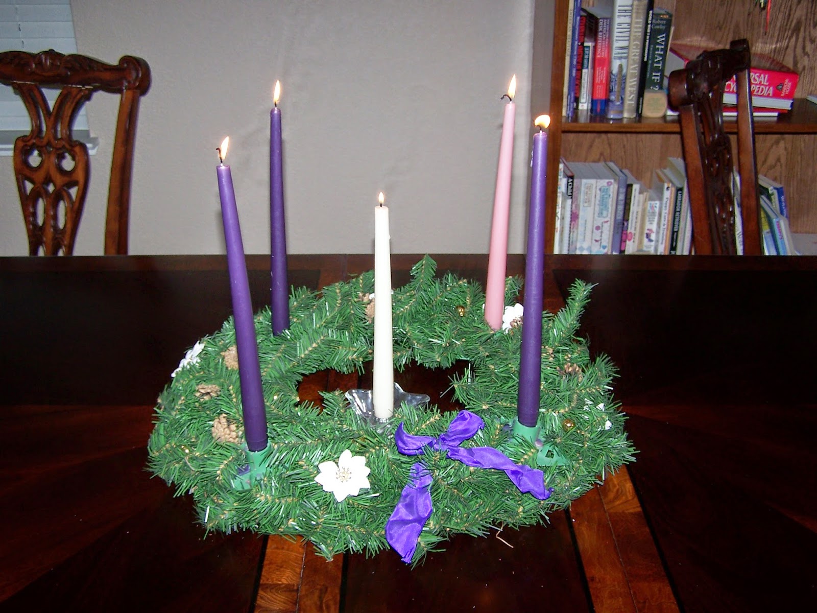 The Advent wreath became popular in Germany and Scandinavia, and worked its way to Britain and America. Traditionally it’s a flat evergreen wreath with four candles—three purple and one pink, or four red candles—with a white candle in the middle.
