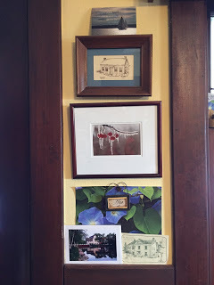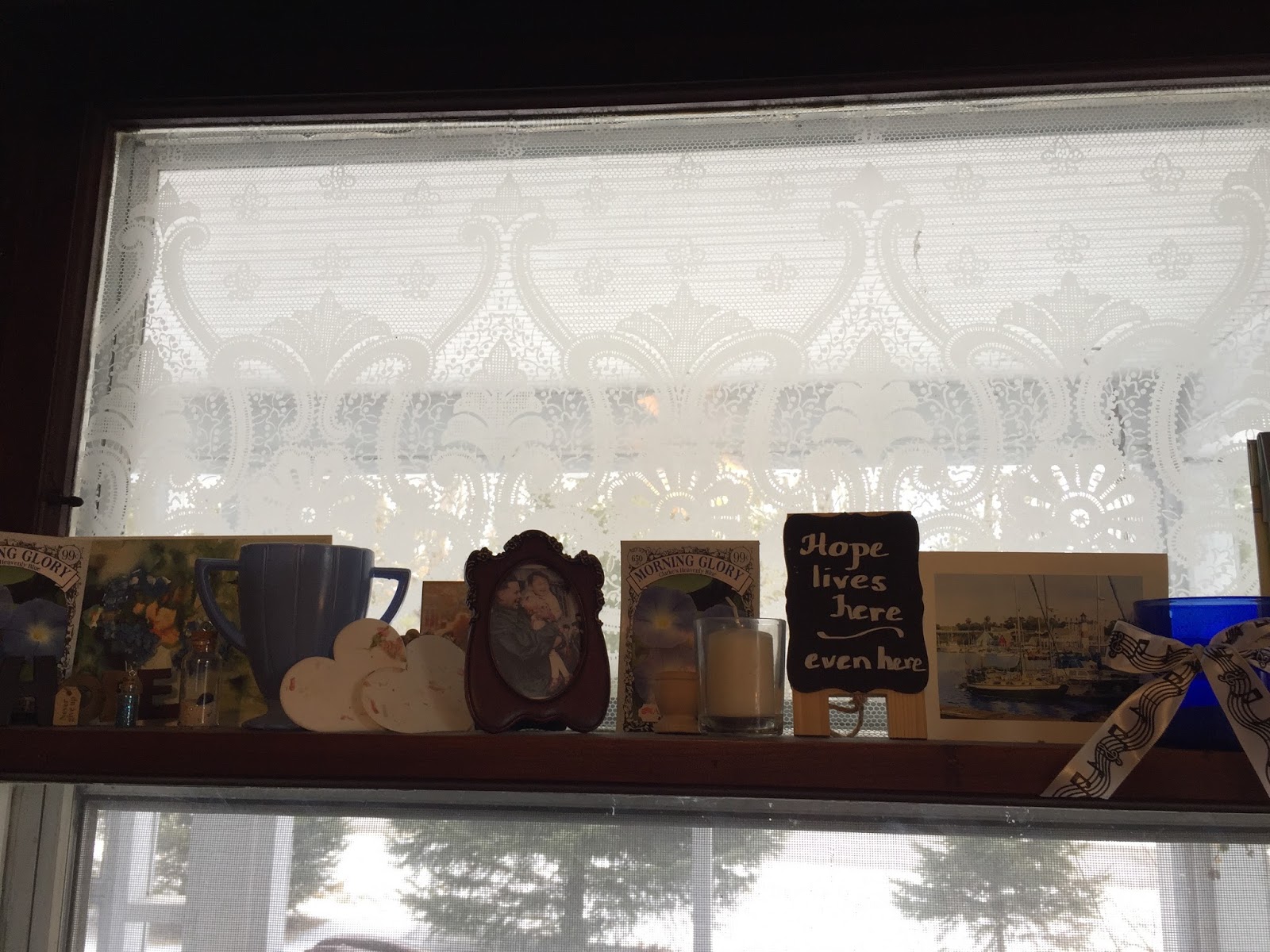 On the ledge just beneath the etched glass in that same window is another collection, When the Morning Glory Blooms, a notecard with a watercolor image of the Oceanside, California waterfront which was the setting for All My Belongings, a photo of my Marine dad holding a Korean orphan during the Korean conflict which helped inform my writing in When the Morning Glory Blooms. The “Hope lives here” chalkboard showed up in a meaningful scene in As Waters Gone By. I’m getting ready to add a photo of the stunning boardwalk along the shore in Algoma, WI—the setting for Restoring Christmas, and a picture of the ancient walking bridge in Stillwater, MN—the setting for An Endless Christmas. The musical note ribbon is a reminder of the book Song of Silence.