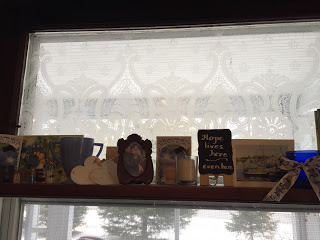 On the ledge just beneath the etched glass in that same window is another collection, which includes morning glory seeds reminiscent of