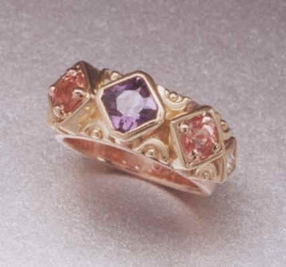 My “Treasure”To celebrate the publication of THE JEWELS OF WARWICK, which was my first historical novel, and my husband Chris's and my 15th anniversary, I had this ring made for me by John Reynolds of Goldsmiths 3 in Concord, Massachusetts. The center stone is a purple sapphire, the two surrounding stones are pink topaz, and next to them are diamonds. It's set in 18K rose gold.