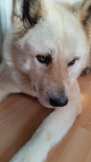 This is where the humour comes in. About 3 years ago, our first son—#2 child—agreed to dogsit for an acquaintance, only to discover two weeks later when it was time to return the dog that the owner had moved house. He’d duped my son into having a dog that he and his then fiancée—now wife—hadn’t planned on keeping. Needless to say my son fell in love with Mika, a white/golden Akita Shepherd, but struggled to keep her, what with work and a wife who had become extremely ill with undiagnosed Crohn’s disease. Eventually, my son changed jobs and was away from home a lot and of course his wife couldn’t cope with a pregnancy, home and dog. So they had to make the decision to let Mika go.