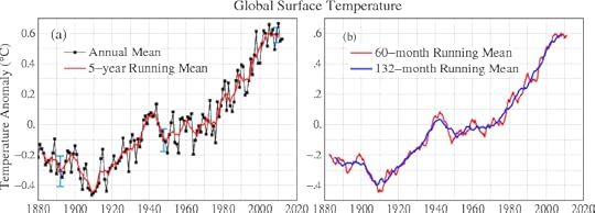 60-month and 132-month running means of global surface temperature anomaly with a base period 1951-1980.