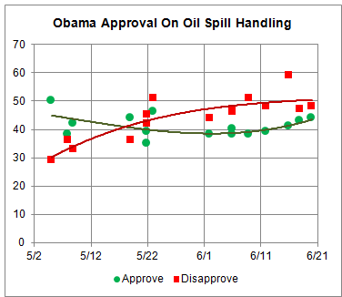 This is Gallup's tracking poll since January. Pretty hard to discern any meaningful trend. You certainly would be hard pressed to pick out any evidence of a BP-disaster effect.