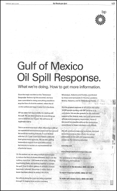 Since the disastrous Gulf Coast oil spill, BP and the other companies responsible for the tragedy have been beefing up their lobbying and public relations efforts. Today, the oil giant has full-page ads in the Washington Post, New York Times, Wall Street Journal, and USA Today defending its response to the oil spill. From the ad:
