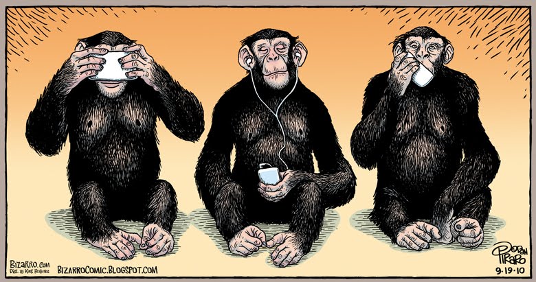 I was pleased when I came up with this take on the famous "see no evil, hear no evil, speak no evil" adage, but didn't think much of it beyond that. I didn't predict that it would be as popular as it turned out to be; I got quite a lot of emails about it. I guess many of us are weary of seeing everyone buried in electronic devices constantly. Cops say that a person wearing headphones is more likely to be victimized by a r...