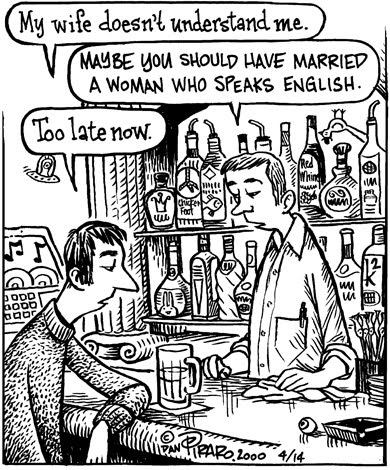 I got out of the habit of posting older cartoons for a while, but I enjoy it and so do many readers (perhaps you are one of those?) so I'm back to it today. I've always enjoyed this take on the cliche of the guy whose wife doesn't understand him. In fact, this guy could have been me.When I was 20, I traveled through Europe with a backpack and a train pass and while in Milan, I met a beautiful Romanian woman who was a few years older than I. We spent many weekends visiting museums and parks together and I developed a huge crush on her and would have been stupid enough to marry her and take her back home with me if she'd been willing. Thankfully she wasn't. She spoke five or six languages fluently, but English was not one of them. We communicated by means of a bizarre combination of the hundred-or-so English words she knew and the hundred-or-so Italian words in my vocabulary. The rest was pantomime and pictographs. It was terribly romantic but I can only imagine what calamity would have ensued if she'd come back to the U.S. with me, learned English, and we had found out what each other were really like.