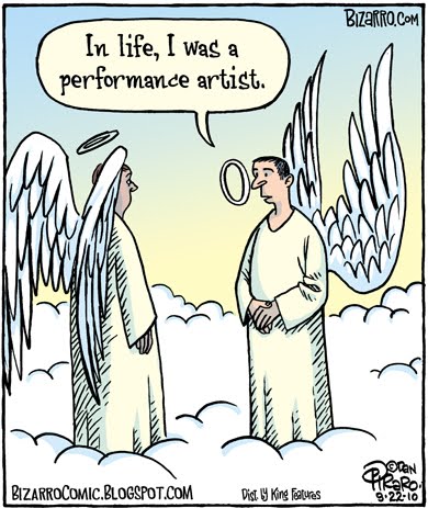 Instead, I'll have to use what I call "language" to describe it: A couple of angels in Heaven are looking at another angel who is upside-down, his head and shoulders buried in the clouds. His halo is above his feet, his robe is falling down, but not far enough to expose his underpants (which would be considered pornographic by daily funny pages standards.) One of the two onlookers says, "In life, he was a performance artist."