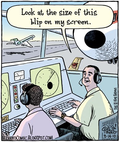 Bizarro is brought to you today by Naked Hikers.I'm not sure how I feel about this air traffic control cartoon. It's completely unrealistic, of course, the dude at the radar would know that something was wrong long before it got to this point. But I suppose the visual is sort of fun, the big dot on the screen then the big dot on the plane's nose. Whatever. A cartoon-a-day for over 25 years, they can't all be classics.