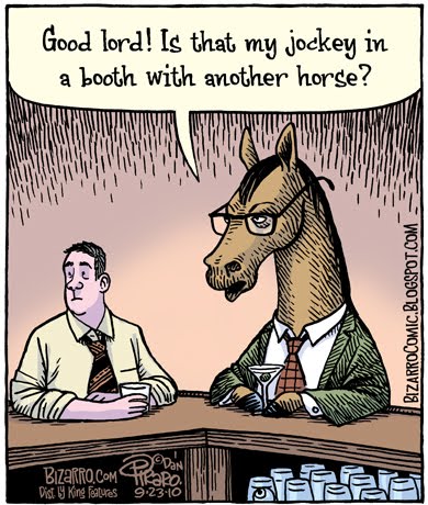 And now a horse-in-a-bar joke. This is one of those weird cartoons that doesn't relate much to real life, but to me, much of the humor is in the look on the horse's face. I put a lot of effort into getting just the right attitude and expression on my characters, I hope you, the reader, notice and appreciate that. Some do, some don't, that's the way the cartoon cookie crumbles.