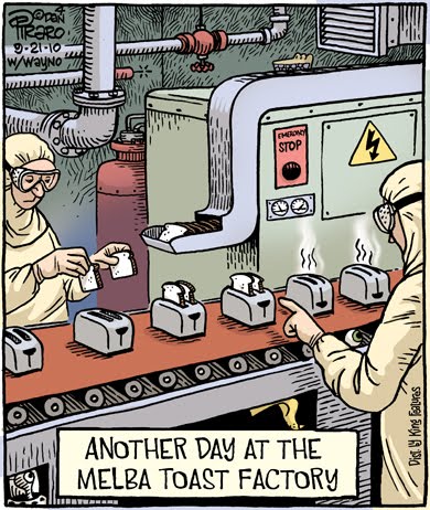 Next up is the melba toast factory, another collaboration with my good friend, Wayno. He correctly points out on his blog that smaller bread and toasters would be both more realistic and funnier. I agree completely, but err on the side of safety in these matters because in many markets, my cartoons print the size of a business card. I'm not kidding. It's a wonder anybody bothers to read comics in those kinds of papers.Part of the problem is that newspapers aren't doing well financially and need to reduce the amount of space they use on things that cost money (comics, columnists, games) as opposed to make money (advertising), and another part is that most cartoonists don't draw in a manner that needs to be viewed any larger than a postage stamp, so newspapers don't think much of shrinking the comics.