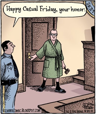 This brings us to Casual Friday. I've never worked in an office with a dress code and have always pitied those who do. It's particularly ridiculous when you have to wear something completely outside the norm, like a choir robe. Would people show less respect for someone in a suit? The British really go to town with this tradition, dressing their judges up like old women. Even their lawyers (which they have another name for; "chips" is it?) have to wear wigs and doilies. Try as I might, I cannot understand this kind of behaviour. (spelled the British way.) For consistency's sake, they should also make the defendants dress up in costumes. Perhaps something more amusing to break up all that black and grey. I'd like to suggest a duck costume since if things don't go well, they may be going "up the river."