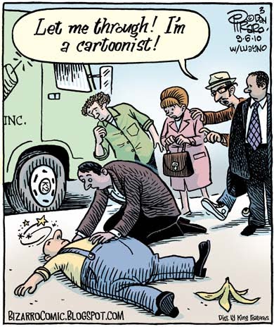 The first cartoon shown here is a take on the cliche, "Let me through I'm a doctor" deal. In this case, the cartoony-looking guy has slipped on a banana pe...